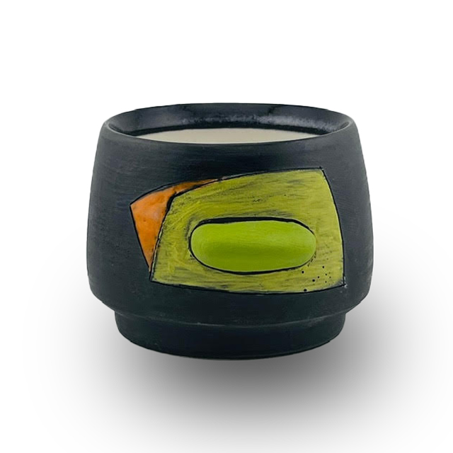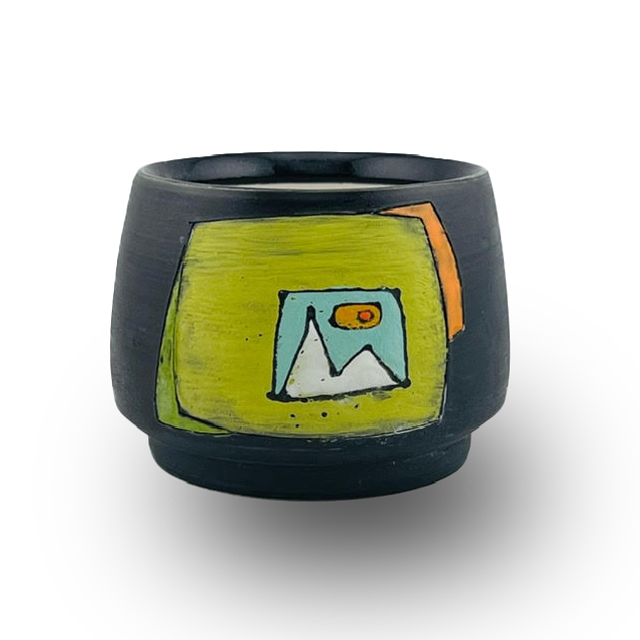 Wheel thrown porcelain sipper with colored slips, underglaze transfer, and colored clay finger nub for added comfort.