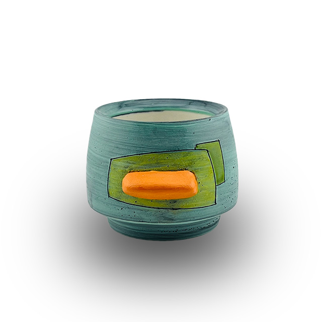 Wheel thrown porcelain sipper with colored slips, underglaze transfer, and colored clay finger nub for added comfort.