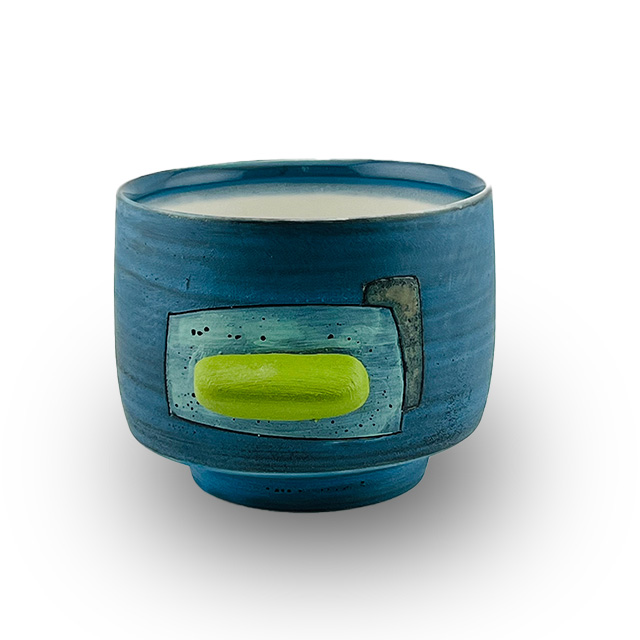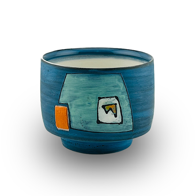 • Wheel thrown porcelain sipper with colored slips, underglaze transfer, and colored clay finger nub for added comfort.