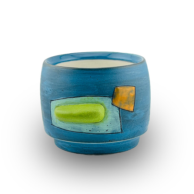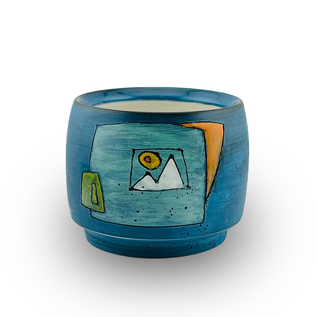 Wheel thrown porcelain sipper with colored slips, underglaze transfer, and colored clay finger nub for added comfort.