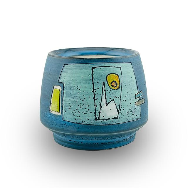 Wheel thrown porcelain sipper with colored slips, underglaze transfer, and colored clay finger nub for added comfort.