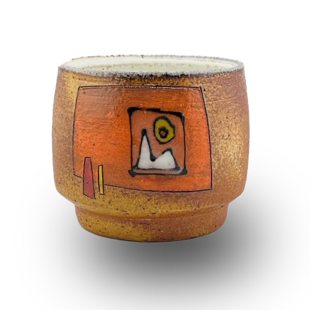 Wheel thrown soda fired stoneware sipper with colored flashing slips, underglaze transfer, and finger nub for added comfort.