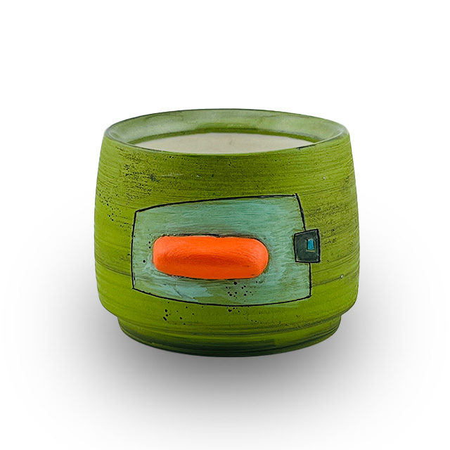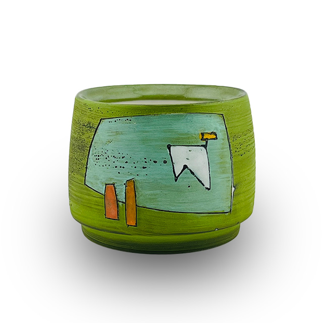 Wheel thrown porcelain sipper with colored slips, underglaze transfer, and colored clay finger nub for added comfort.