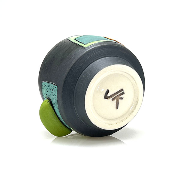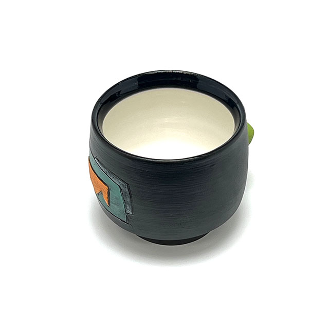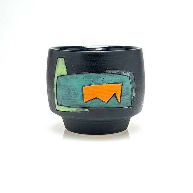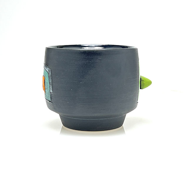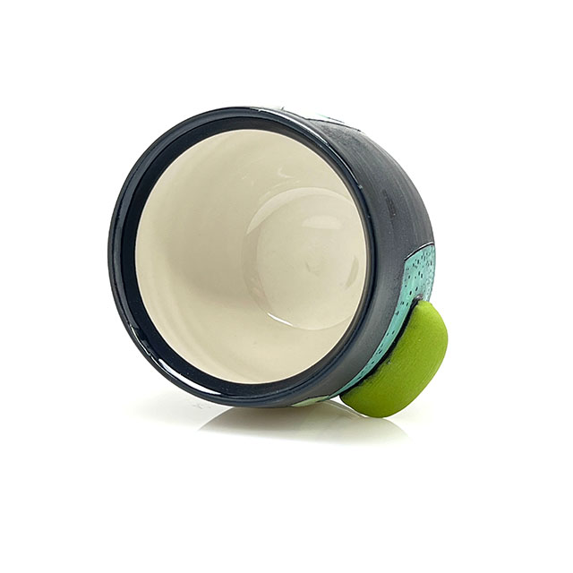 Wheel-thrown porcelain sipper featuring layered colored slips and a hand-shaped colored clay finger nub for added comfort. Each piece is finished with unique, one-of-a-kind color designs.