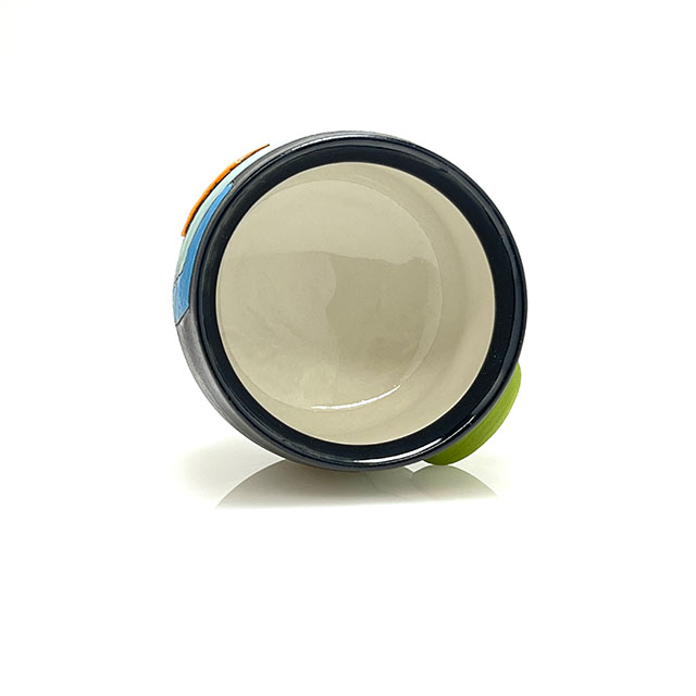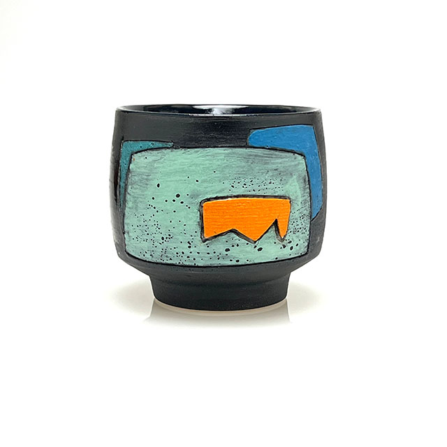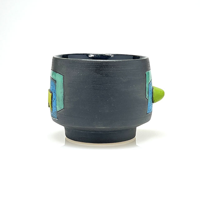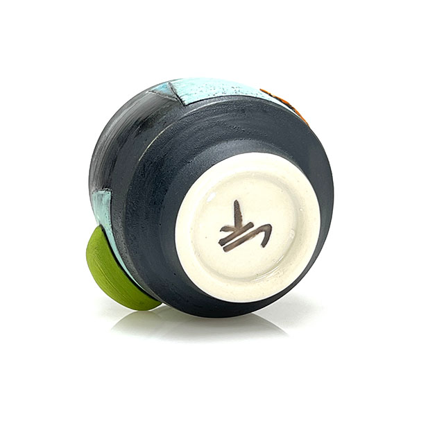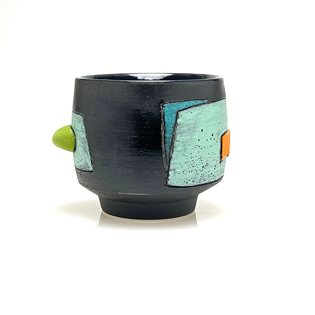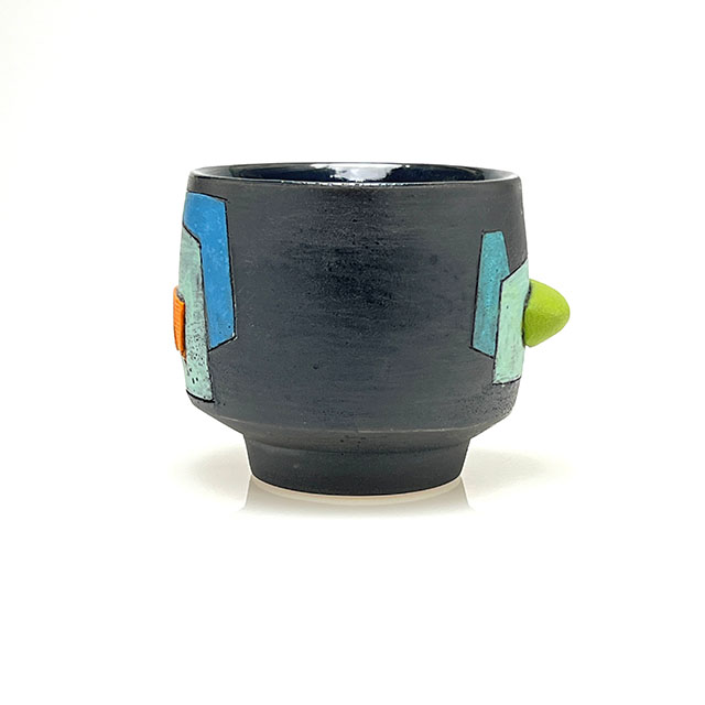 Wheel-thrown porcelain sipper featuring layered colored slips and a hand-shaped colored clay finger nub for added comfort. Each piece is finished with unique, one-of-a-kind color designs.