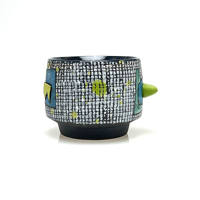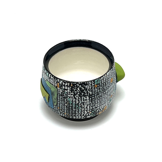 Wheel-thrown porcelain sipper featuring layered colored slips and a hand-shaped colored clay finger nub for added comfort. Each piece is finished with unique, one-of-a-kind color designs.