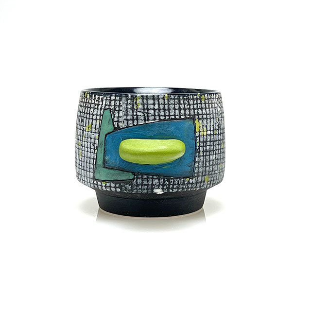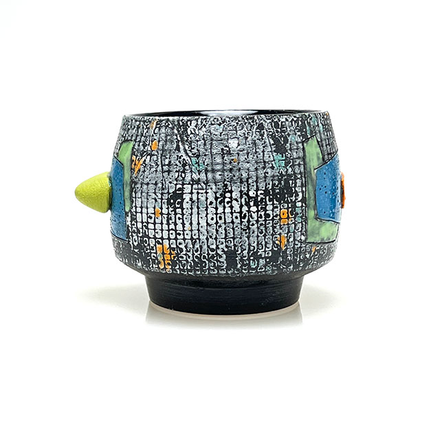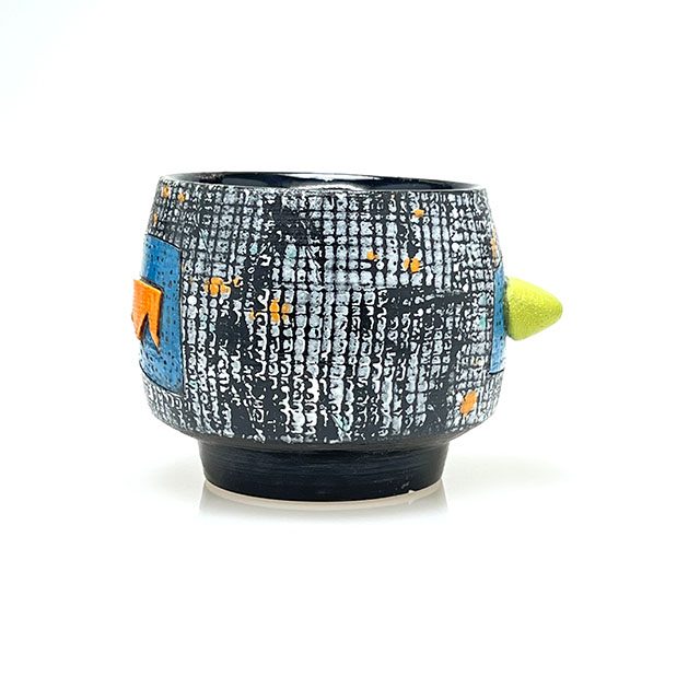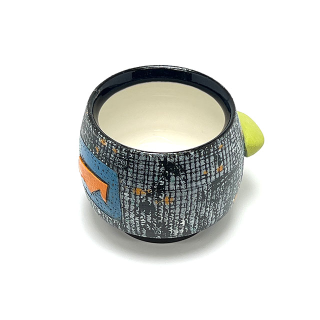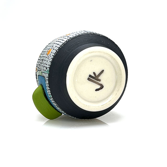 Wheel-thrown porcelain sipper featuring layered colored slips and a hand-shaped colored clay finger nub for added comfort. Each piece is finished with unique, one-of-a-kind color designs.