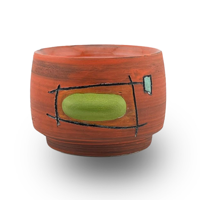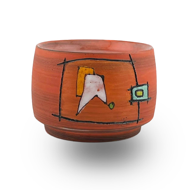 Wheel thrown porcelain sipper with colored slips, underglaze transfer, and colored clay finger nub for added comfort.
