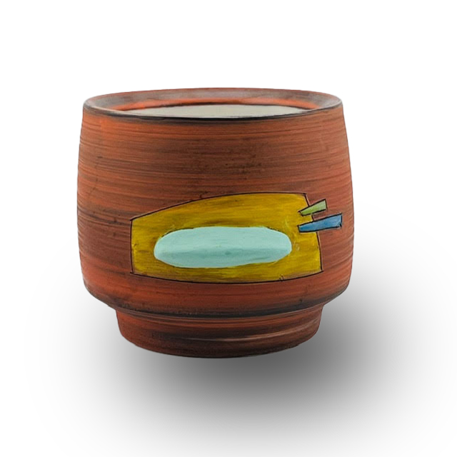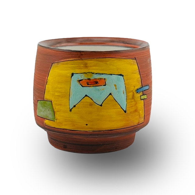 Wheel thrown porcelain sipper with colored slips, underglaze transfer, and colored clay finger nub for added comfort.