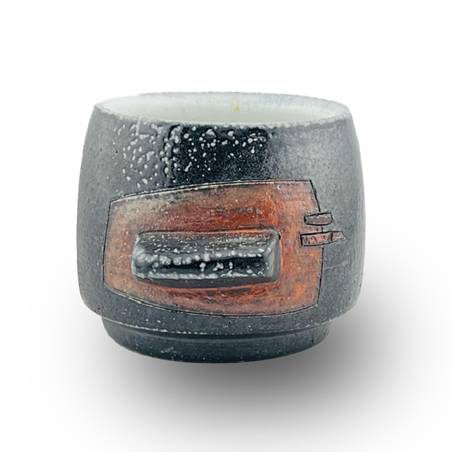 - Wheel thrown soda fired stoneware sipper with colored flashing slips, underglaze transfer, and finger nub for added comfort.
